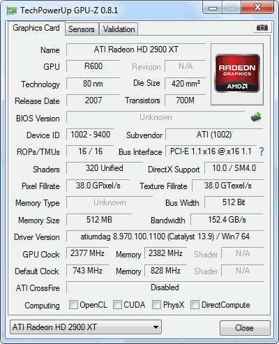 Hi-end card from 2007. First GPU with 512-bit memory bus on market. Some versions have even faster GDDR4 memory and 1GB VRAM.