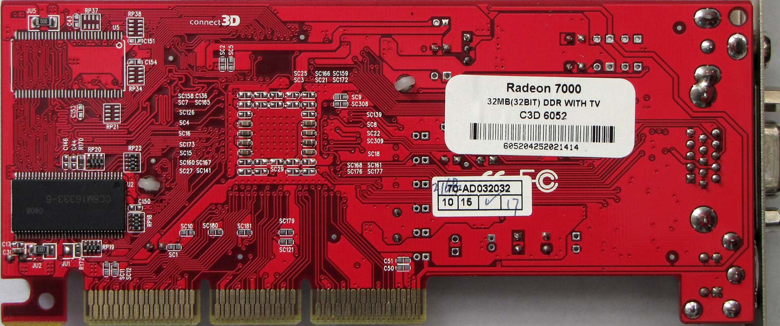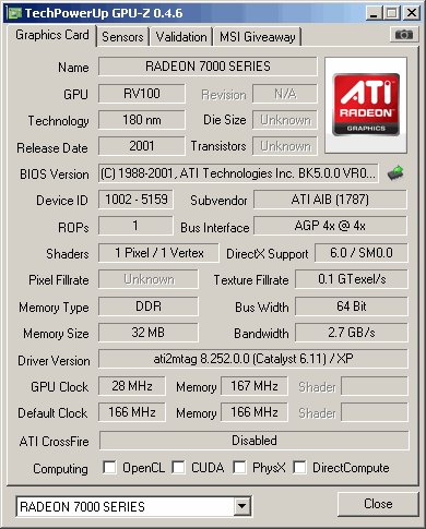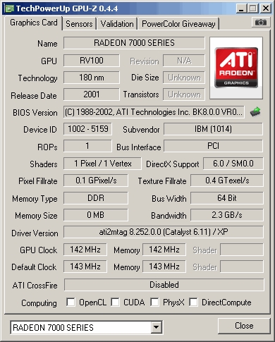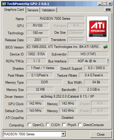 HIS Radeon 7000 32MB DDR (32-bit) - Card has only 32-bit memory bus, GPU clocked at 143MHz and memory at 286MHz effectively.