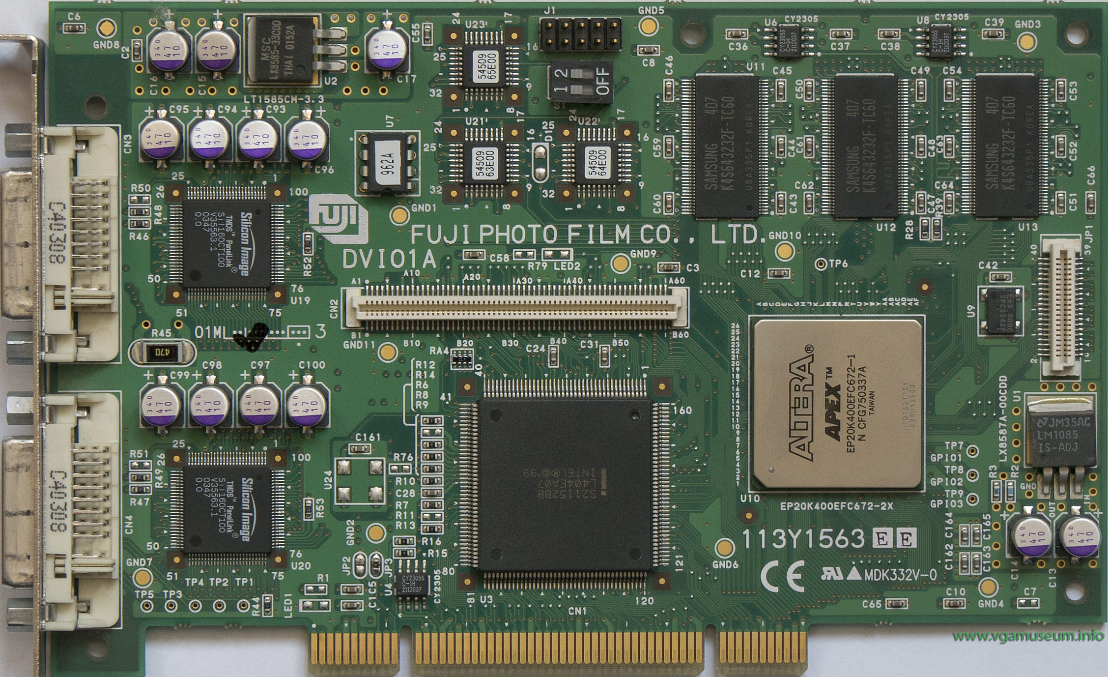 Main chip is probably APEX EP20K400E embedded programmable logic device (PLD) from Altera. Card was used with 2 profi monitors in hospital. Missing compactible monitor, drivers and any info about this card (name, device it came from, anything). Tried to connect it as secondary card, Windows detects card as 3 devices - Silicon Motion LynxEM+ (probably used only as DOS device), PCI bridge and unknown device with id VEN_127F&DEV_1105&SUBSYS_905410B5&REV_00.